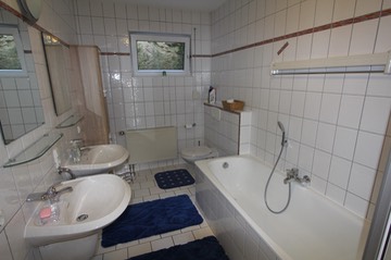 Bad mit Doppelwaschbecken, Badewanne und Duschkabine (am rechten Bildrand)